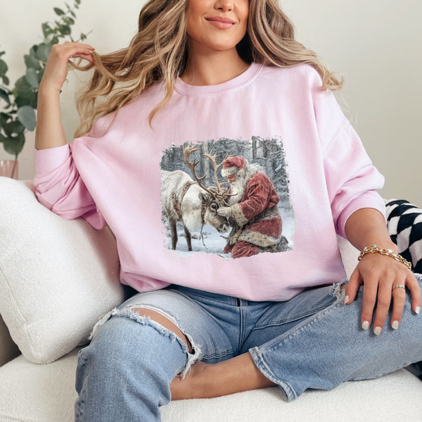 Step into the holiday spirit with this vintage Santa and reindeer design that'll have everyone feeling major nostalgia vibes. Perfect for anyone who loves that retro Christmas charm with a playful twist. Whether you grab the cozy crewneck or classic tee, you're basically wearing a warm hug from the '80s. Sleigh all day in style.